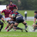 2017年度ムロオ関西大学Aリーグ第3節・後半第1試合。連敗スタートだがフィジカルやスクラムの強さには目を見張る立命館大学と、下馬評どおり伝統のスクラムの強さを活かし安定感ある戦い方で連勝スタートの京都産業大学の一戦。台風接近により、大雨で所々に水たまりが目立つ天然芝のグランドコンディションのもと、立命大のキックオフで始まった。早くも2分、先制したのは立命大だった。敵陣10M付近で京産大オフサイドにより得たペナルティのボールをタッチに蹴り出す。ゴール前15M付近ラインアウトから大きなFWがモールを走らせ、②HO山口達也がゴールポスト横にあっさりトライ。ゴールは⑩SO藤高将が決め、立命大は幸先の良いスタートを切る。(7-0)