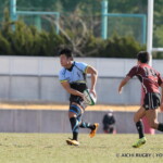 そして、後半32分、九州大学は相手陣22m内のラックから出たボールを、相手ディフェンスの裏にキック、インゴールに入ったボールを⑭三浦が抑えて、24−10と点差を縮める。
