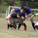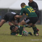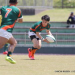 共に1勝1敗でむかえた、愛知と静岡の直接対決は、前半3分、愛知が相手陣ゴール前スクラムから④川岸が仕掛けトライ、5-0とすると、前半5分には、相手陣ゴール前10mで静岡が持ち込み形成されたラックで⑩堀尾がターンオーバーしトライ、トライを重ねる。