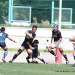 早々に学生選抜は中盤からのキックカウンターから右展開、ゴール前にトライのチャンスを伺うも豊田通商のカバーディフェンスで食い止める。