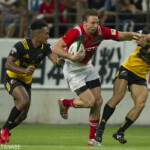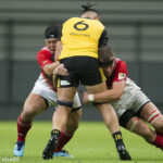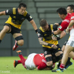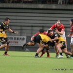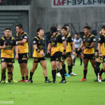 トヨタ自動車は堅守で対抗すると後半18分、中盤での攻防から⑦姫野がブレイクダウンでターンオーバー、右に展開すると⑬イエーツが走りきりトライ、25-10とさらにリードを広げる。