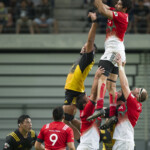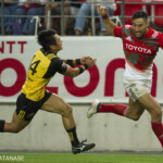 その後、前半31分、サントリーは1PG決め、12-10と点差を縮め、さらに終了直前にもPGで逆転のチャンスを得るも失敗に終わり、12-10のトヨタ自動車リードで前半終了。