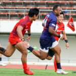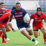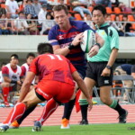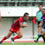 その後、中国電力の早いディフェンスと攻撃で規律の乱れやハンドリングミスを重ねて自陣から中々抜け出せないでいた近鉄。今後の課題が出た。ようやく36分にHLからパトリックが22mLまで前進しセミシに繋ぎ右中間に追加のトライを挙げた。Gもパトリックがここも決めて14-0になる。3分あった前半ロスタイム中、42分にはセミシが相手ボールをHL付近でインターセプトし50m独走してゴール下にトライ。Gも決まって21-0で折り返しとなった。