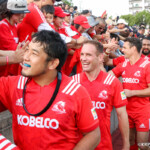 *神戸製鋼コベルコスティーラーズはヘッドコーチのデーブ・ディロンがゲームキャプテン日和佐選手の膝をたたき、先にコメントする様に促した。