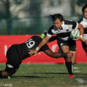 試合は早々の3分、天理大がゴール前8mの相手ボールのラインアウトを奪ってトライを上げて「幸先の良いスタート」、と思われたが、大阪体大も相手陣22m右中間での相手キックを⑬CTB高永明日海がチャージ。最後は⑦右フランカー吉田海が押さえて5-7とし、興味深い試合展開になるかと思われた。大阪体大は天理大の縦攻撃をしっかり止めるものの、攻撃面ではミスが出て相手陣に進めない。そんな中、天理大は23分、ゴール前のラックから展開して⑪WTB中野豪、32分にやはりゴール前ラックから⑬CTBシオサイア・フィフィタがトライを奪って、21-5として前半を終えた。