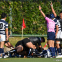 ゲーム開始直後はキックの応酬が続いたが、徐々に大体大が鋭いディフェンスからプレッシャーをかけ10分にゴール前5mラインアウトからモール押し込み、⑧№8吉田海が左隅にトライ、⑮FB中山敦喜のゴールも決まって7対0とした。