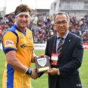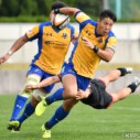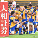 後半は開始早々、Hondaが自陣22mライン内側でターンオーバーに成功したボールを外へ展開し、⑫クリントンが抜け出し、最後は⑬藤﨑がトライ(ゴール成功)をあげ、19-19、再び同点に追いつく。