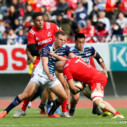 前半は神戸製鋼が得意の形から効率的にスコアを重ねたのに対して、サニックスはここぞの場面での反則でチャンスを潰し、相手陣22メートルラインを越えることもままならない。