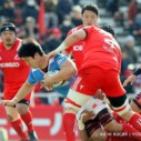 しかし前半35分、東芝はリターンパスを受け取った①橋本が20mほどを走りきってトライし、14−12、点差を2点に縮める。