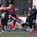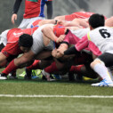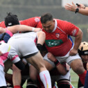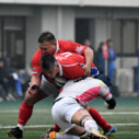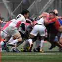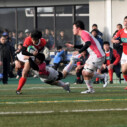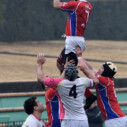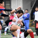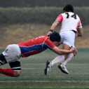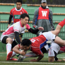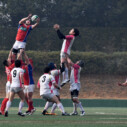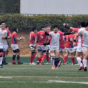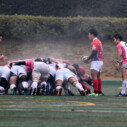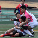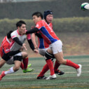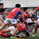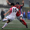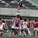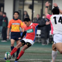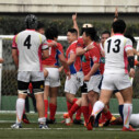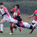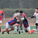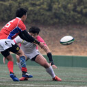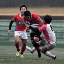 試合開始早々、積極的にボールを動かす駒場は11分、18分にトライ・ゴールを上げ0-14と六甲に強烈なパンチを見舞う。後手を踏んだ六甲は25分のPGチャンスをモノにし3-14とするも、PR1加村の危険なプレイによるシンビンもあり波に乗れず、逆にPGで加点した駒場のペースのまま、前半を終了する。