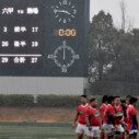 後半、積極的なアタックを仕掛けた六甲は、44分敵陣ゴール前スクラムからサイドを突き、LO4福島が右隅にトライ。(G不成功8-17)46分駒場LO4松渕が不正なプレーでシンビンとなると、六甲は一気に押し込む。WTB14三木のビッグゲインもあり、敵陣ゴール前まで迫るも、駒場の好ディフェンスの前に、反則を犯してしまう。逆に58分六甲のキック処理ミスを突いた駒場は、CTB12新村が左中間に飛び込みトライ、コンバージョンも決まり8-24。67分にもFB15鈴木がPGを決め、さすがに雌雄は決したかと思われた。後がなくなった六甲だが、慌てず一つ一つのアタックを丁寧に繰り返し70分、73分とトライを積み重ね、22-27と射程圏にとらえる。駒場は75分過ぎから、六甲陣ゴール前でFWがボールキープを図るも、六甲FWのプレッシャーに耐え切れず、逃げ切れない。インジャリータイムに駒場陣へ攻め込む六甲は、ゴール前でスクラム戦を繰り返す。数度駒場FWの反則を誘い、ペナルティトライの雰囲気も漂い始めた88分、スクラムからサイドアタックを仕掛け、最後はLO4福島が左中間に飛び込み起死回生のトライ。コンバージョンも決まり29-27と土壇場で勝利を掴んだ。