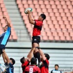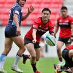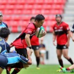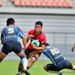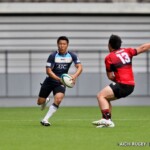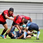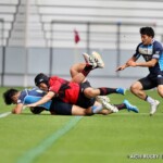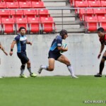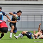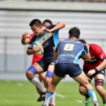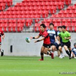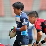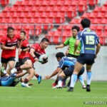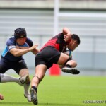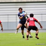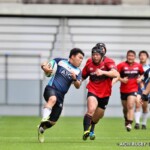 それでも愛知教員クラブは巧みな接点の攻防を見せボールを奪取、中盤での攻防が続く。再び相手陣に地域を進めた愛知教員クラブは前半19分、右ラックから大きく展開、⑪塚本に渡ると左サイドを走りきって左隅にトライ、5-0と先制する。
