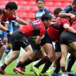 開始早々、愛知教員クラブはボールを大きく動かす連続攻撃で前進、ゴール前まで地域を進める。対するレッドウイングスはスクラムで圧力をかけて対抗する。
