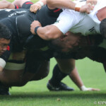 そして試合が動いたのが19分。サントリー⑬村田大志がゲインした後でHonda⑮半井優太が故意のオフサイドでシンビン。さらにその2分後、Honda⑭渡部寛太がハイタックルでシンビンになりHondaが一気に2人少ない展開となる。そして24分、サントリーがゴール前でスクラムを押し⑳ショーン・マクマーンが持ち出しトライ。3-26とサントリーがリードを広げる。