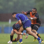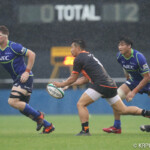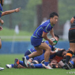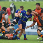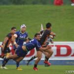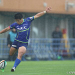 その拮抗を破ったのはNEC。縦への連続攻撃からじわりじわりと敵陣に攻め込み、前半36分に12番アマナキ・サヴィエティがディフェンスラインを突破。ゴール前10mまでボールを運び、最後は13番松浦康一が右隅に飛び込んでトライ。追加点を挙げる。直後にシャトルズも10番トゥシ・ピシからボールをもらった14番松井謙斗が右サイドラインギリギリを抜け出し大きくゲイン。しかし濡れたボールをノックオン。好機でのミスが続いたシャトルズは得点を挙げることなく、0点で前半を終えた。