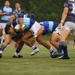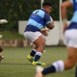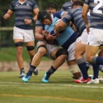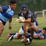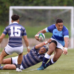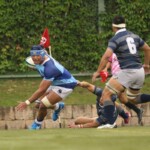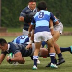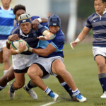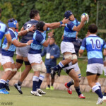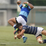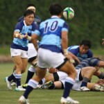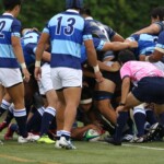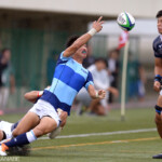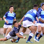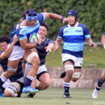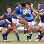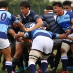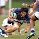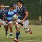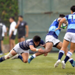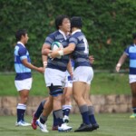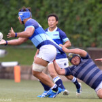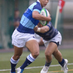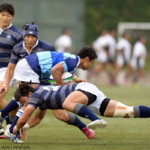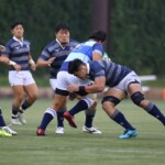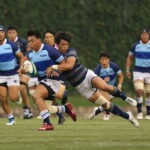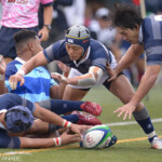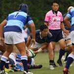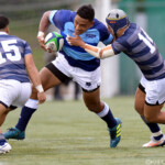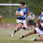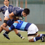 対する摂南大も相手ディフェンスを突き、走力を生かした攻撃で2トライ。前半は同志社のディフェンスが光った。