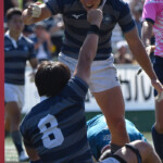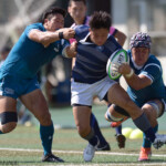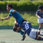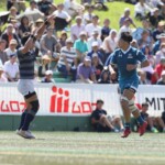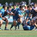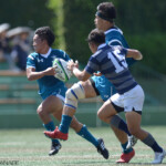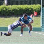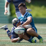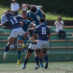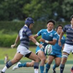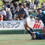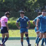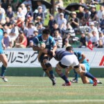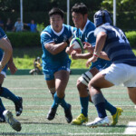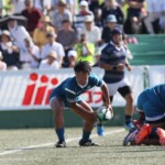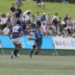 お互いに疲れもピークと思われるが、攻撃に手を緩めない両チームは、30分に近畿大がSH9番田原からパスを受けたNO8酒井がゴールポスト下にトライ、GKもCTB12番福山が成功し、35-42と再逆転。