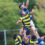 この後、一進一退が続くが、25分に立命大はゴール前5Mラインアウトからモールを押し込みLO⑤横井達郎がトライ、FB⑮吉本匠がゴールを決め引き離す(28-19)。