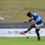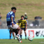 13分、摂南大は敵陣深く入ったところで、ペナルティから攻撃を仕掛け、CTB⑬テビタ・タイからNO.8⑧マタエナ・イエレミアというホットラインの攻撃で右中間ゴールラインを割る。FB⑮ヴィリアミ・ツイドラキがゴールを決め先制する(0-7)。