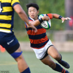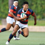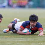 先制したのは関西学院。前半8分にバックスラインをフォローした左PR1番キャプテン原口浩明が左中間にトライ。立命館も直後の13分にこちらはバックスが大きく展開し、最後は左WTB11番木田晴斗が左隅に押さえて7-5と追いすがる。