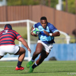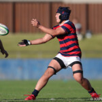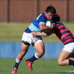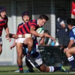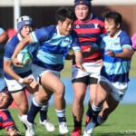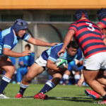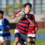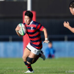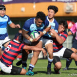 その後も京都産業大学は摂南大学のパワフルな外国人選手にも低く激しいタックルでトライを許さない。摂南大学は風下に立ち、プレッシャーを受け反則が増えてしまう苦しい展開に。すると22分、京都産業大学は敵陣ゴール前5mスクラムから8アサエリが持ち出してトライ。キックも決め21-26と逆転に成功する。しかし摂南大学も反撃に出る。15テビタがDFを引きずりながら大きくゲイン。そして22山田の左へのキックパスが11岡田に入りトライ。
