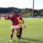 26-26の同点に追いつく。しかしその数分後、京都産業大学10家村のDFの裏へのキックを11堀田がトライ。再びリード。26-33となりこのまま試合終了。