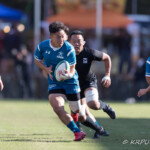 近大はファーストスクラムを押し込むなど気合のはいった入り。4分、ハーフェイライン付近からCTB⑬中辻眞大からFL⑦宮本学武そしてWTB⑪宮宗翔とパスを繋ぎ、見事なランで中央に回り込んでのトライ、CTB⑫福山竜斗がゴールを決め先制する。(0-7)