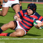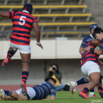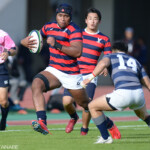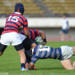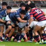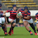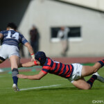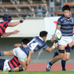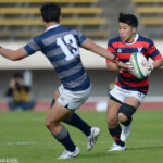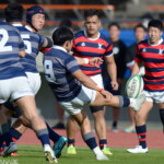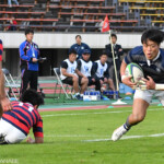 これが押し切れないと見るやボールをラックサイドに散らし、最後はHO②宮﨑達也が抜け出しトライ。⑬城川がゴールを決め逆転に成功、このまま時間が経過し前半が終わる。(7-13)