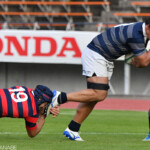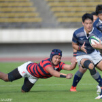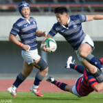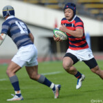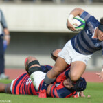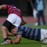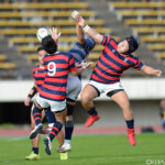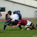 21分にも、京産大は10分と同じような位置で得意のスクラムで圧力をかけ、同大のスクラムでの反則を誘う。これも⑬城川がPGを決め効率よく引き離す。(0-6)