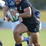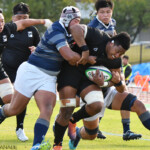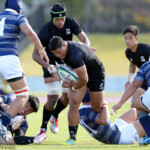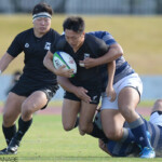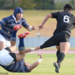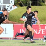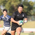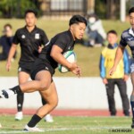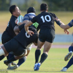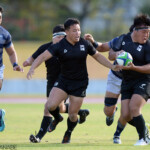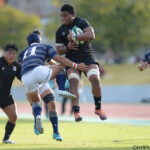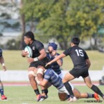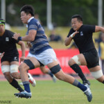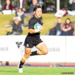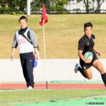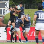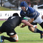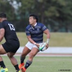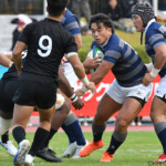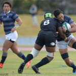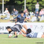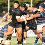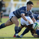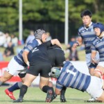 その後は天理大の攻撃を同大は粘り強いデフェンスで阻むが、38分ゴール前左中間のペナルティーから右へ展開13番フィフィタが右中間にトライし0-14、40分には9番藤原忍がトライを重ねて0-19とする。
