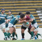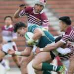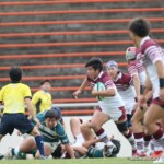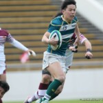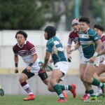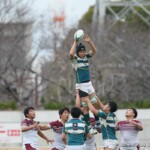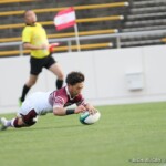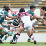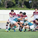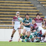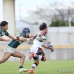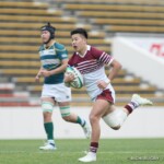 後半20分、中盤ラインアウトの絶妙なロングスローをキャッチして大きく前進すると、FWが縦攻撃、最後は②竹谷が左中間に押し込みトライ、コンバージョンも成功し19−47と追い上げる。