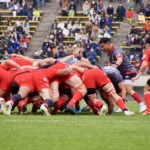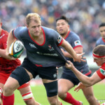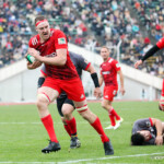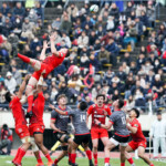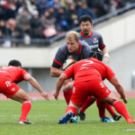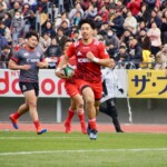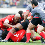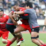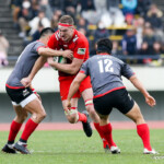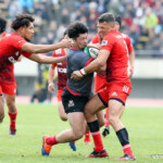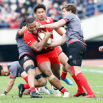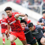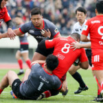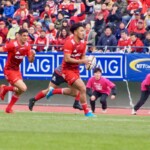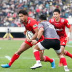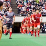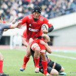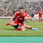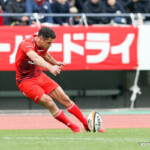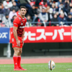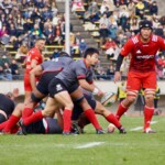 前半30分ハーフライン付近から9番日和佐がラックからボールを持ち出し5メートルラインで10番ダン・カーターへパス。中央へトライし、ゴールも成功。22-3。