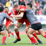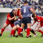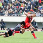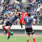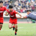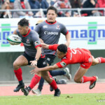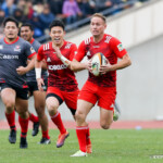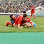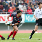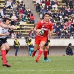 前半終了間際、キヤノンの反撃。敵陣内で右から左へ大きくパスを展開し、12番三友が左中間へトライ。ゴール成功22-10とし、前半を折り返す。