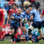 しかし神鋼は20分、キックオフ後先程と同様、右サイド敵陣ゴール前まで攻め寄り、ラックから左に展開後NO8のタウムア・ナエアタが抜け出て右隅にトライ、ゴールは失敗するも10-12と逆転。28分には敵陣ゴール前10mライン左中間付近でのペナルティからSOダン・カーターがペナルティゴールを決め、10-15とする。