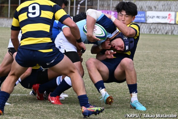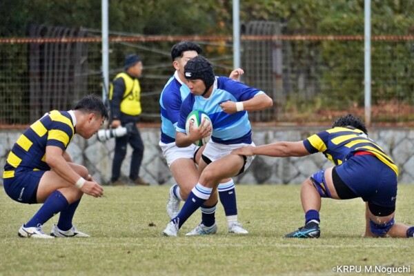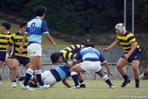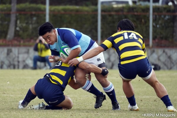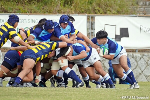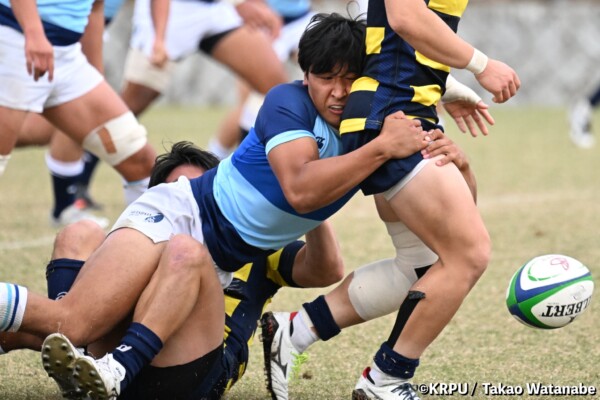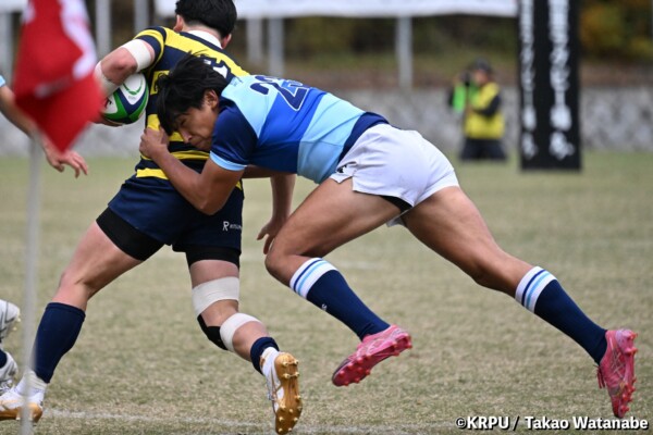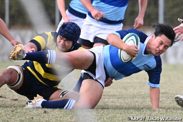 摂南大はもう一つ欲しいところだったが、16分は立命大の方に。立命大SH㉑福本颯翔のいい位置へのハイパントボールに双方が競り合い、ラッキーバウンドを立命大WTB⑭西村長がキャッチ。30mほど走り切って右中間にトライ(GK成功)。(26-5)