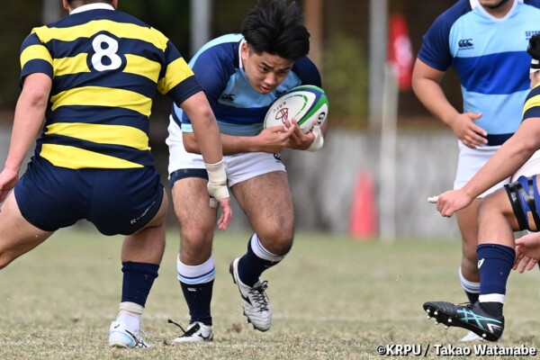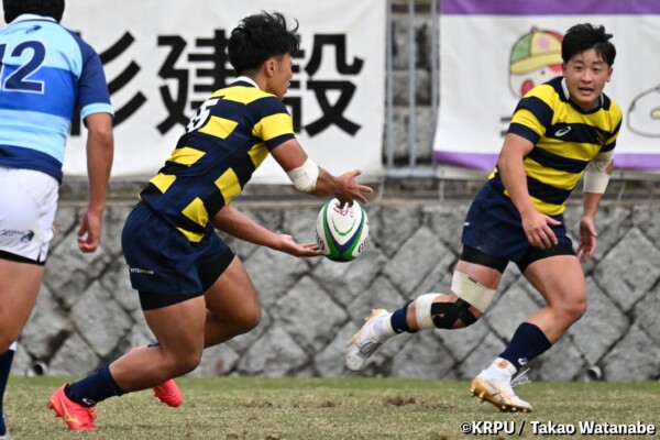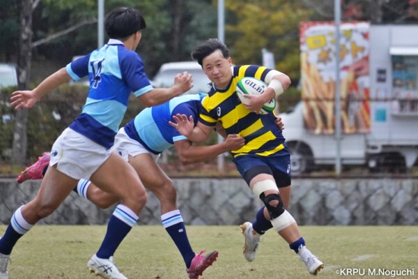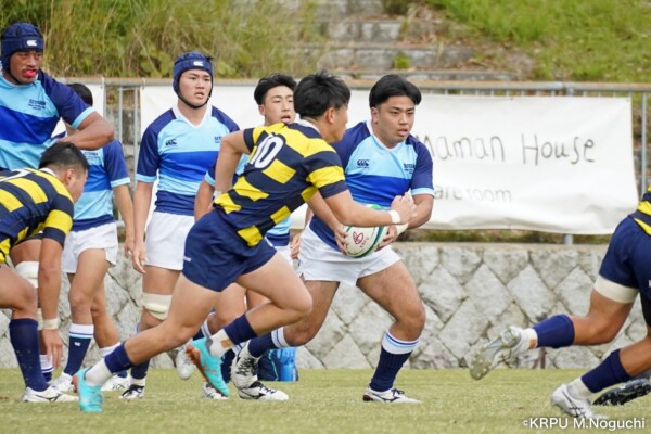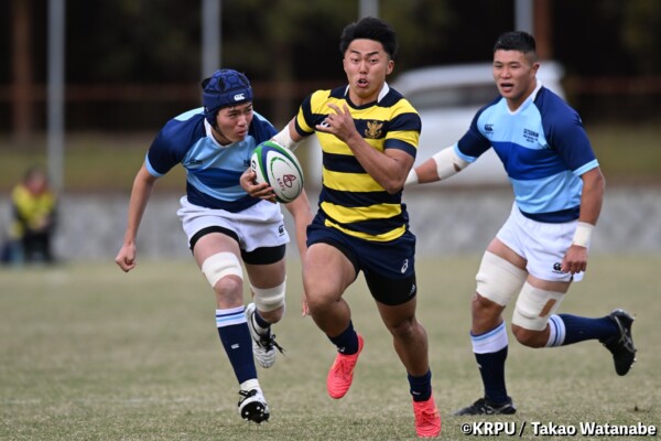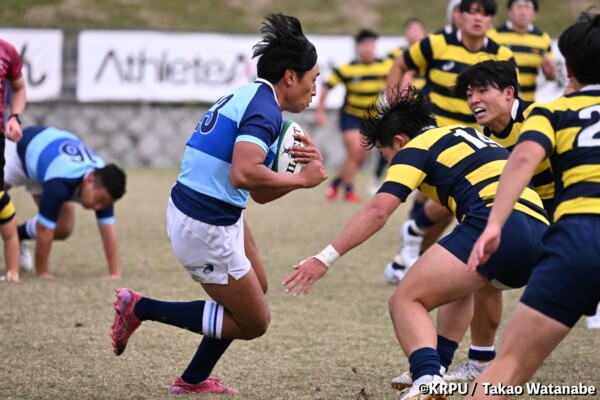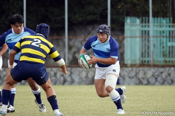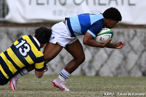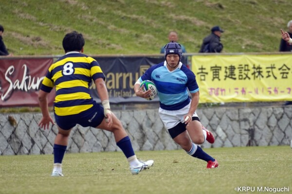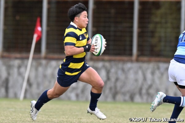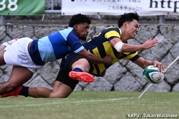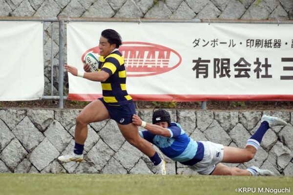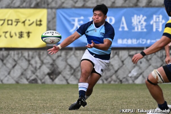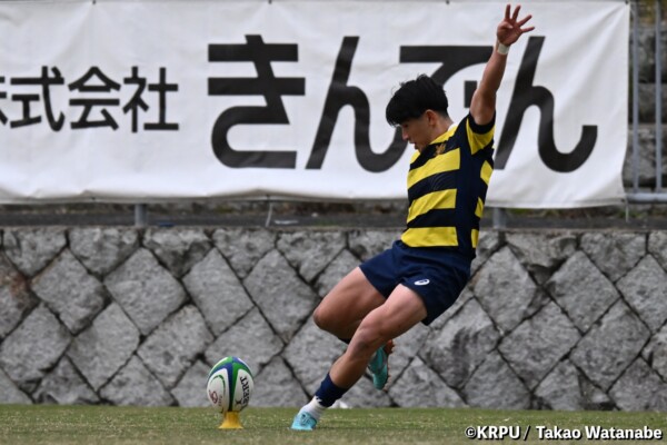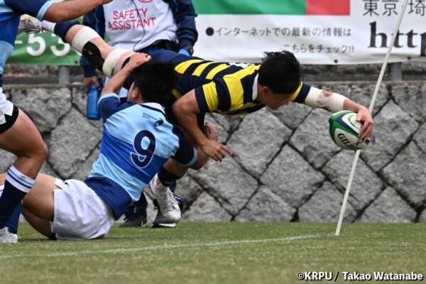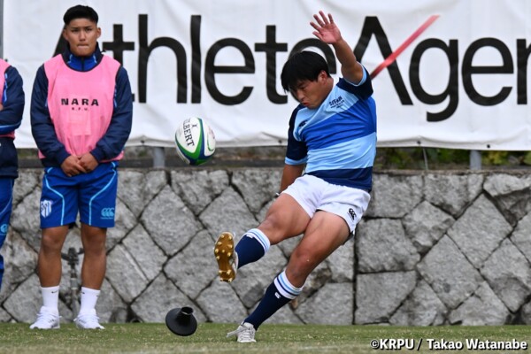 序盤5分、立命大が敵陣15m付近ラインアウト(LO)から左へ展開、3フェーズ目で右へ展開、CTB⑬中村颯太が少し溜めて鋭く走り込んできたFB⑮御池蓮二にパス、スワーブで相手を交わし右中間へトライ。ゴールキック(GK)はSO⑩山下真之介が決めて先制する。(7-0)
