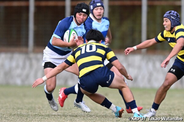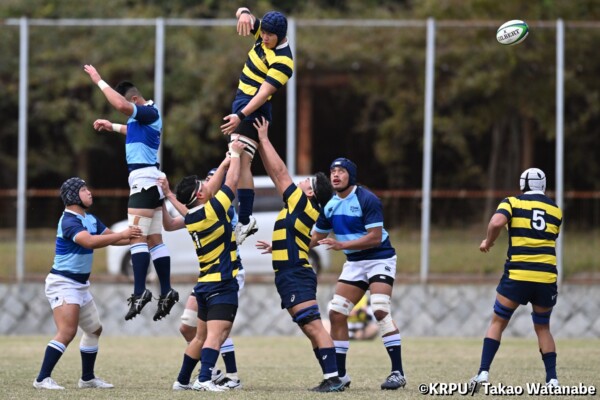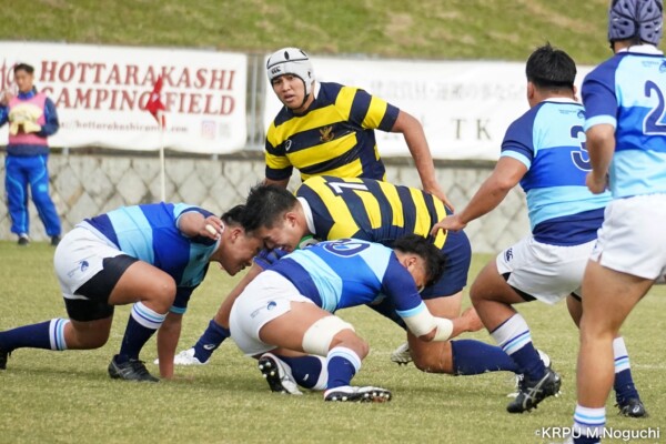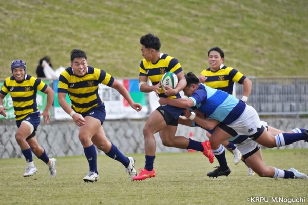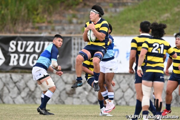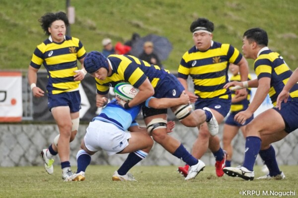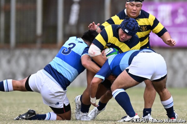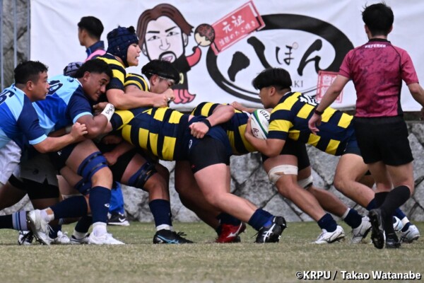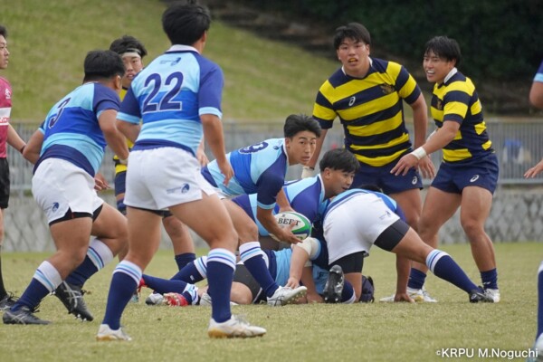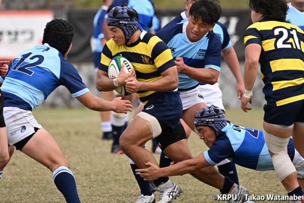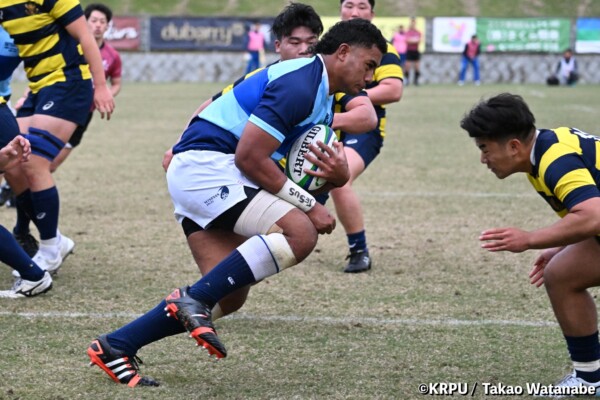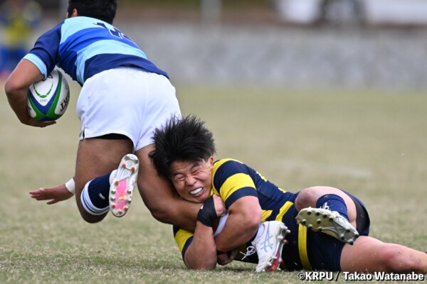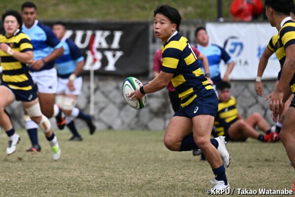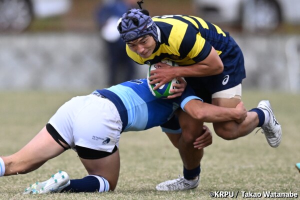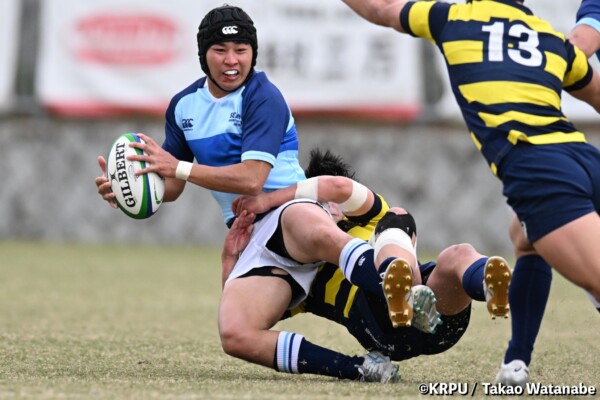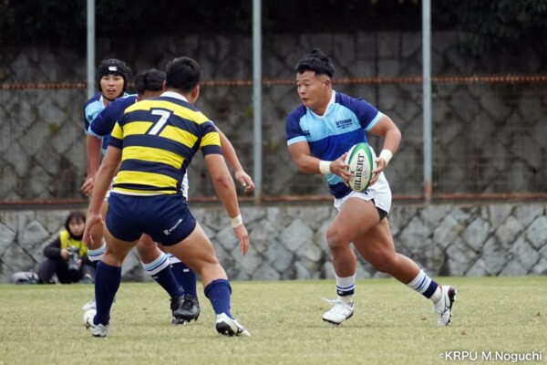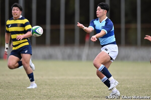 序盤5分、立命大が敵陣15m付近ラインアウト(LO)から左へ展開、3フェーズ目で右へ展開、CTB⑬中村颯太が少し溜めて鋭く走り込んできたFB⑮御池蓮二にパス、スワーブで相手を交わし右中間へトライ。ゴールキック(GK)はSO⑩山下真之介が決めて先制する。(7-0)