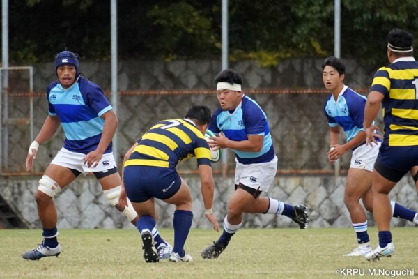 20分にも立命大。FL⑥榎本匡志がゴール前ペナルティからそのままトライ(勝負ありの展開)。29分にも、HO②大本峻士がモールからのトライ(それぞれGK成功)で追加点。(40-5)