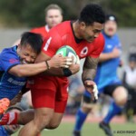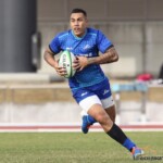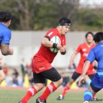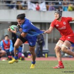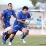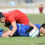 その相手陣22m内側右ライアウトから、ゴール前へ迫りFWでフェイズを重ね、さらに、ラックでのハンドで得たペナルティでスクラムを選択。スクラムサイドを攻めフェイズを重ねたのち、⑮ピシから左へ飛ばしパスすると、⑪渡邉が左隅へトライ。後半5分、5-14とする。