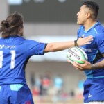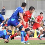 相手陣で攻撃を続けるシャトルズは、再度、ペナルティを活かし、相手陣ゴール前へ攻め込み、攻撃を続け、さらに、ゴール右側でマイボールスクラムを得ると、スクラムサイドを攻め、FWでフェイズを重ねたのち、左へ展開し、⑮ピシが縦へ切れ込み、ラックが形成されると、そのラックから⑫ヴァカが抜け出し、ゴール中央へトライ、コンバージョンも成功し、後半32分、12-14と2点差に詰め寄る。