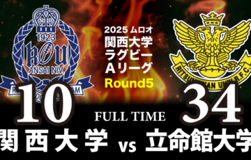 マッチレポート 2025ムロオ関西大学ラグビーAリーグの第4節の後半2試合はくもり一時雨、無風の鶴見緑地球技場で開催。第1試合は関西大学(以下、関西大)VS関西学院大学(以下、関学大)が対戦。 関西大は1勝2敗、勝点4を…