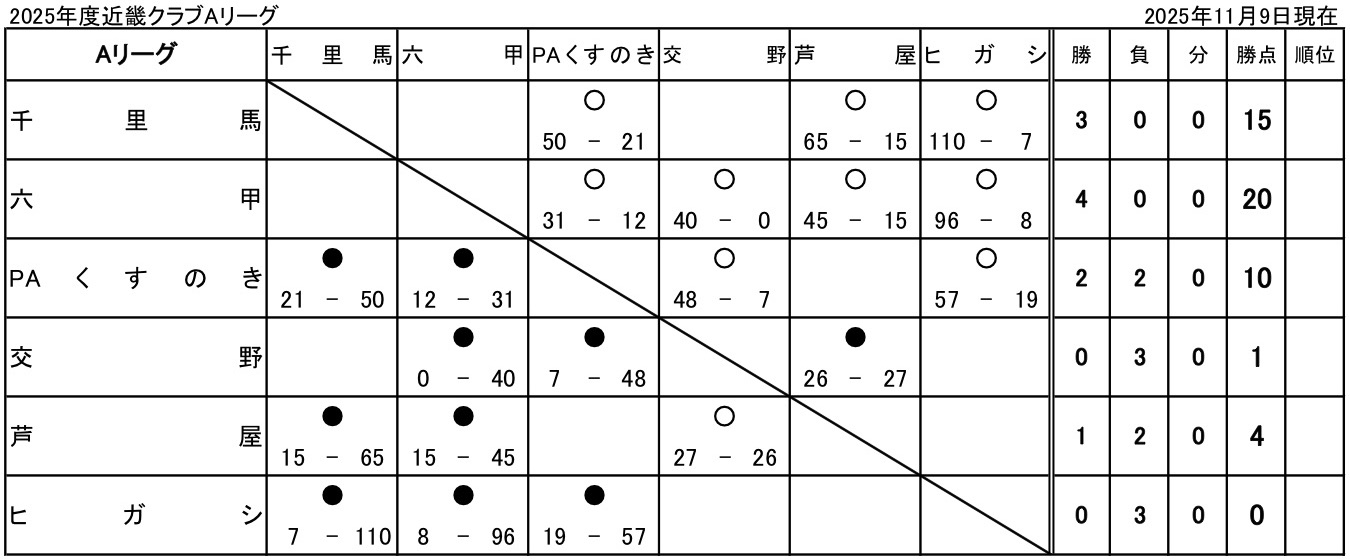 カテゴリーA:千里馬クラブ、六甲ファイティングブル、パフォーマンスアカデミーくすのきクラブ、交野RFC、芦屋クラブ、ヒガシクラブ