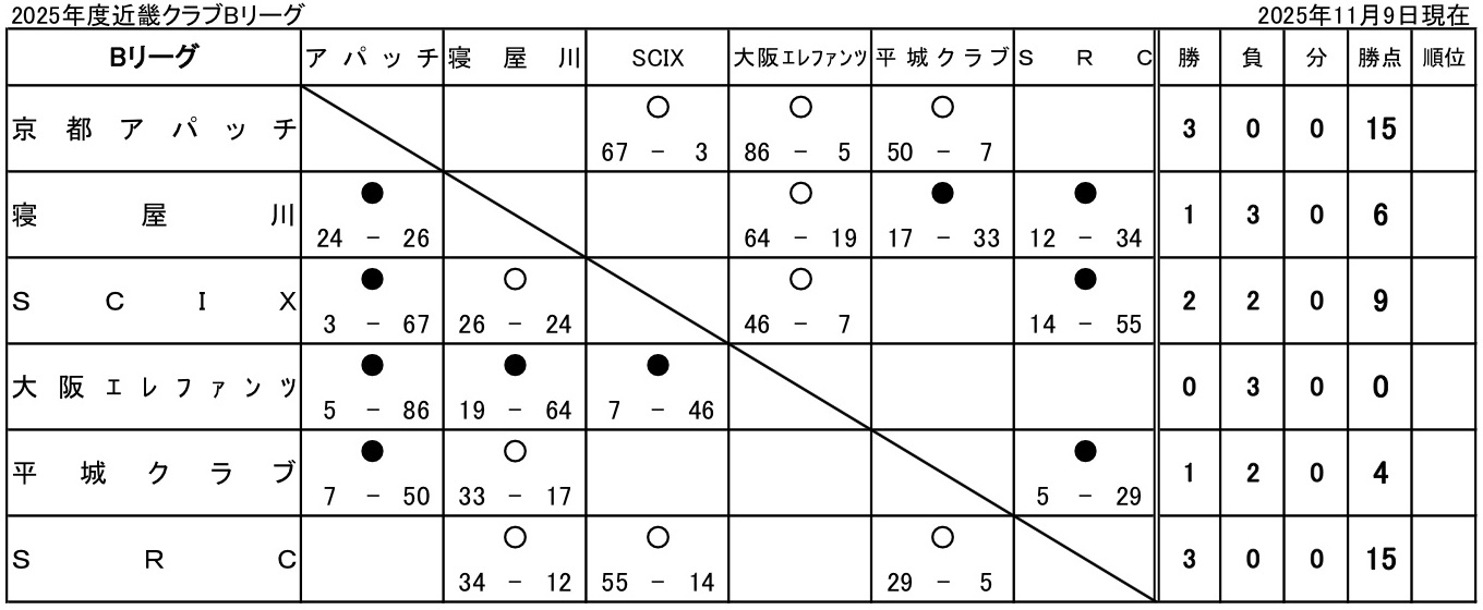 カテゴリーB:京都アパッチRFC、寝屋川クラブ、SCIX、大阪エレファンツRFC、SRCバーバリアンズ、平城クラブ