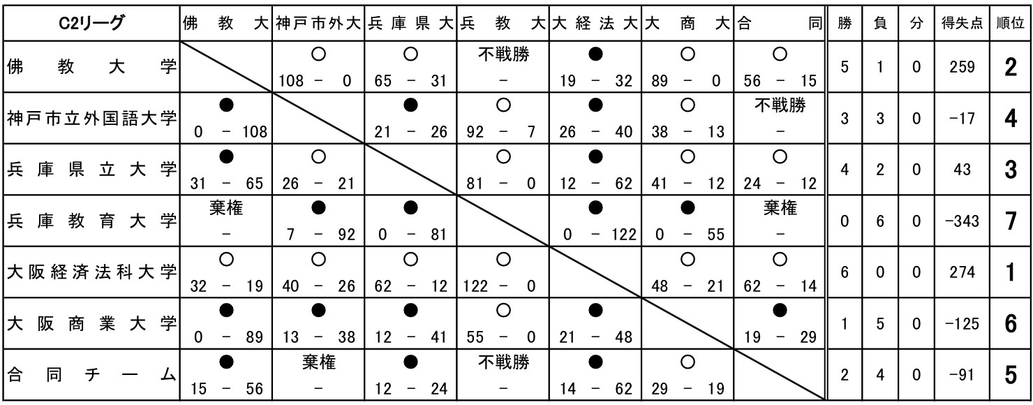 | 花園大学 大阪工業大学 大阪学院大学 大阪公立大学 帝塚山大学 神戸学院大学 和歌山大学 滋賀大学 | 佛教大学 神戸市立外国語大学 兵庫県立大学 兵庫教育大学 大阪経済法科大学 大阪商業大学 合同チーム |