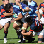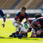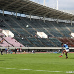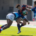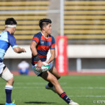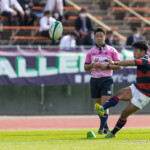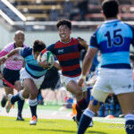 後半10分摂南の連続トライ。中央付近ラインアウトから左へ展開。ディフェンスラインを10番山田が切り裂き12番東へパス。そのまま独走し中央へトライ。ゴール成功26-24。