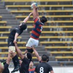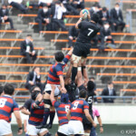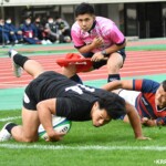 27分天理陣22メートルを超えたあたりでのラインアウトから関学は少しずつ左サイドでボールを回し前進する。天理のDFも粘るも関学左サイドから中央にいた3番(小寺)へパスが回りそのまま前進。パスをつなぎ最後は23番(坂原)左サイドでトライ。キック成功10-7。