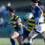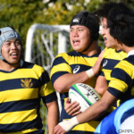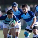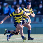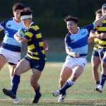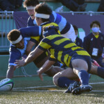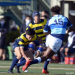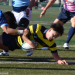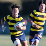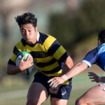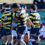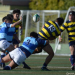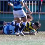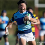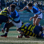 立命館大学は手を緩めずトライを重ねる。後半29分には、自陣から右へ左へと展開し、相手陣ゴール前へボールを運び、④田中がゴール左側へこの日4トライ目となるトライ(コンバージョン成功)、26-48とする。