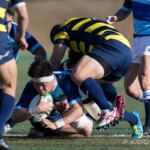 さらに立命館大学は、PKで前進。相手陣22m外側左ラインアウトから右へ左へと展開し、ゴール前中央でのFW攻防となり摂南大学のオフサイドのペナルティー。スクラムで優位に立つ立命館大学はスクラムを選択。そのスクラムのボールをコントロールできず、チャンスは消えかかったかと思ったが、摂南大学がペナルティー。