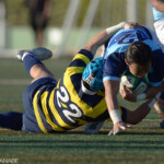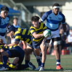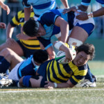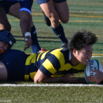 対する立命館大学は前半21分、相手陣22m外側中央で摂南大学のノッコンのボールを拾い、右へ展開、さらに折り返して相手陣ゴール前中央へ、ラックを形成し左に展開、⑫山口が左中間へトライ、14-5とする。