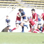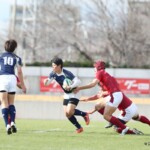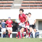 対する松山大学はスペースを有効に見つけ前進、ラインアウトから工夫されたサインプレーでゴール前に進む。すると前半10分、FWのゴール前連続攻撃から⑨長崎が抜け出し左中間にトライ、コンバージョンも成功し7−7と追いつく。